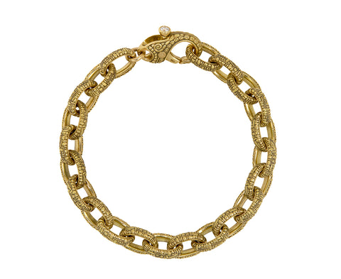 Stunning in its timeless, earthy design, this Alex Sepkus chain can be worn solo or nestled in to a stack of your other favorites. The matte, engraved 18K yellow gold oval links connect to one another to create the heavy strand which closes with an 18K yellow gold and diamond lobster clasp.