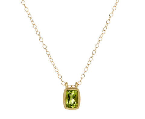Stunning in its minimal, modern design, this Elizabeth Street necklace is an instant classic. The cushion cut peridot is covered in a surface of light reflecting facets to reveal its stunning shade and natural characteristics. It is set in a heavy, hand-made satin finish bezel of 14K yellow gold and hangs from the center of the 14K yellow gold chain. Perfect alone or with your other favorites.