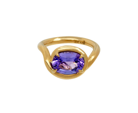 With its stunning color and minimal design, this Vanessa Fernandez ring has been handcrafted in her Miami studio. The shimmering, oval tanzanite is covered in a surface of light reflecting facets and held by four delicate prongs to the center of the polished 18K yellow gold setting. The polished band swirls and curves, creating a statement-making ring that's all about the stone.