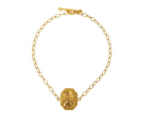 This sweet, symbolic Cathy Waterman charm bracelet perfectly incorporates her signature child charm. The rectangular 22K yellow gold child charm is set at the center of the 22K gold tiny lacy chain bracelet.  Alone it exudes a restrained, feminine luxury, but it will also look perfect added to a layered collection.