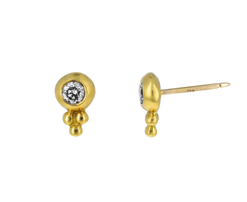 Stunning in their understated, timeless sophistication, these Prounis earrings are the perfect, wear-with-everything pair with a hint of sparkle. The meticulously hand crafted posts of 22K gold hold shimmering diamonds above a trio of small golden granulation.