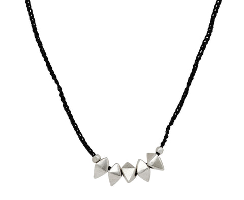 With its earthy and sculptural edge, this Jill Platner necklace is a cool, casual standout. A row of five pointed sterling silver beads are arranged along the base of a crocheted cord to create a tactile row of shimmer. The necklace fastens with Jill's signature sterling silver toggle clasp closure. Designed to be worn every day, this necklace has a durable, eclectic and easy-to-wear elegance.