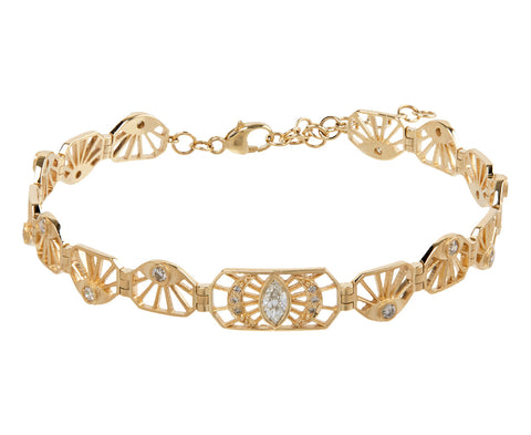With a geometric, earthy design and stunning sparkle, this Celine Daoust bracelet is a perfect addition to a wrist full of favorites or worn alone. The adjustable 14K yellow gold bracelet is composed of shimmering diamond evil eyes and radiating 14K yellow gold lines. A larger, marquise diamond is set in the largest link directly at the center between two diamond crescents. Wear this as an edgy take on the traditional colored stone bracelet.