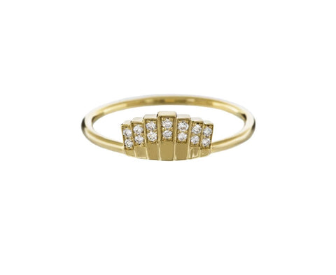 Modern, minimal and with a hint of sparkle, this Jennie Kwon ring adds a striking, yet restrained, geometric style to your ring repertoire. A fan of rectangular gold tabs are set with duos of diamonds at each tip. They connect to the polished 14K yellow gold band at one end to create the perfect crown to your stacked ring collection.