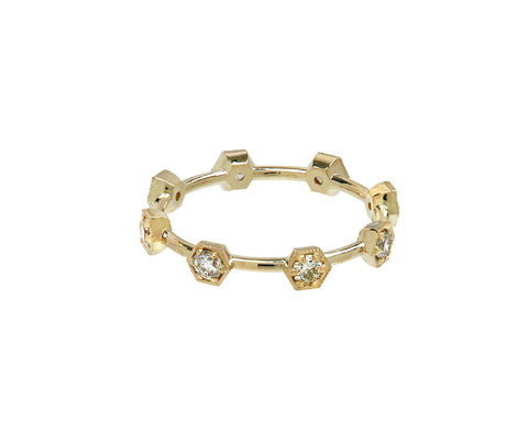 With its delicate design and modern sophistication, this Ila band makes an excellent wedding ring for someone with a slightly edgy sense of style. Each diamond is set in a 14K yellow gold hex setting and spaced along the thin 14K yellow gold band. Wear it alone or stacked.
