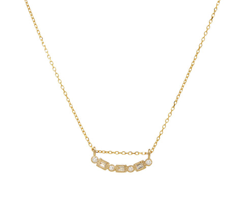 With its playful, minimal design and hint of sparkle, this Jennie Kwon necklace has an effortless sophistication. The arced bar of 14K yellow gold is set with a front surface of small baguette and round diamonds. It hangs suspended like a trapeze from the center of the 14K yellow gold chain.