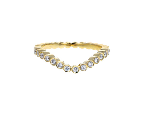 This elegant, modern and sparkling Sophie Bille Brahe diamond ring is a stunning alternative to the traditional wedding band. The sparkling white diamonds are individually set in bezels of 18K yellow gold and dip down slightly at the center of the band. This would also make a stunning addition to any stacking collection.
