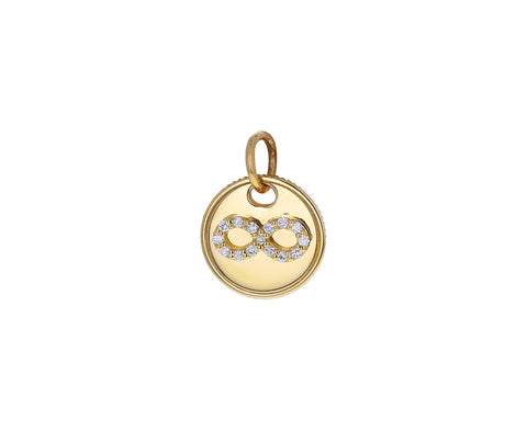 Modern and minimal, add this Foundrae mini coin charm pendant to your favorite chain. The 18K yellow gold mini coin medallion is set with a three dimensional infinity symbol covered in a surface of diamonds. It hangs from the 18K yellow gold bale, creating a pendant that is both modern and timeless.