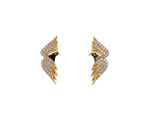 Echoing the shape of tiny eagles, these nature inspired Sorellina earrings can be worn as a stylish alternative to traditional diamond posts. Each of the 18K yellow gold studs have a surface of sparkling diamonds and connect to 18K yellow gold post backs. Wear them in a first or second piercing with anything in your closet.
