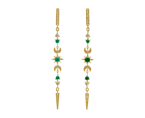 With their playful movement and celestial design, these Celine Daoust earrings also exude a modern sense of style. The 14K yellow gold stars and moons connect to one another and are anchored by a diamond studded drop. Accented with rose cut brilliant diamonds and emeralds these earrings are full of sparkle and iridescence. The composition connects to 14K yellow gold post backs to create a pair of earrings you can wear with everything in your closet.