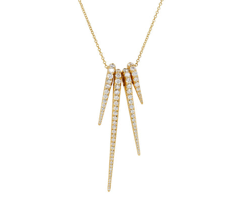 With its distinctive, edgy design, this Melissa Kaye necklace will add a stunning sparkle to any look. Four elongated 18K yellow gold needles are set with round, white diamonds on their front and hang clustered together along the 18K yellow gold chain. With its modern, style-defining look, this will be the piece you reach for to up the ante of any outfit.
