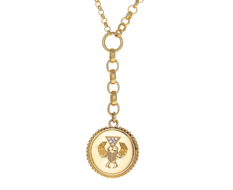 Wear this Foundrae pendant necklace to protect yourself from negativity and allow yourself to build a more productive and positive life. The 18K yellow gold medallion hangs at the base of the medium belcher chain extension at the center of the mixed fine and small belcher chain. The small, open wings scarab sits at the center of the pendant, with one diamond set inverted triangle directly above it. Modern and substantial, this necklace is perfect alone or layered with your other favorites.