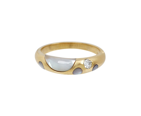 With an edgy sophistication and vintage inspired vibe, this Retrouvai ring is a striking alternative to a plain band. The band of 14K yellow gold is meticulously set with hand cut mother-of-pearl to create large and small polka dots. One round white brilliant cut diamond adds a hint of sparkle. Whether worn alone or added to a stacking collection, or even worn as a casual stand in for your wedding band, it exudes a striking elegance.
