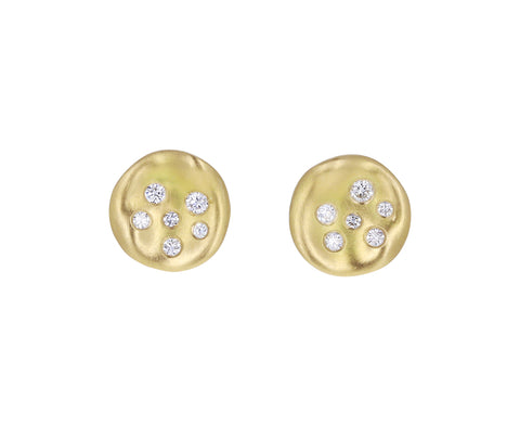 Stunning in their timeless yet modern sophistication, these Nada Ghazal earrings are the perfect take on the diamond stud. The round, matte 18K yellow gold studs have a subtly irregular surface and are carefully set with six shimmering white diamonds. They attach to 18K yellow gold post backs to create an earring you can wear with anything in your closet.