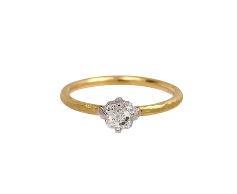 Perfectly balancing a traditional concept with striking modern design, this Todd Pownell ring has a stunning minimalism. The shimmering cushion cut diamond is set in four hand-fabricated platinum prongs and is centered on a hammered 18K yellow gold band. Pair it with one of Todd's bands to complete a wedding set or wear it to celebrate a special occasion.