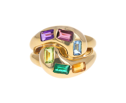 Wear this vibrant Brent Neale ring as a playful, modern alternative to your favorite cocktail ring. With a rocker glam vibe, the polished 18K yellow gold knot is set with multi colored gemstones of citrine, peridot, pink tourmaline, blue topaz, and amethyst and emerald baguettes.