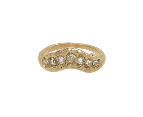 With its subtle imperfections and handcrafted design, this Ellis Mhairi Cameron ring has an understated elegance. The round, white old cut diamonds are set in a tapered V shape in an organic, heavy 14K yellow gold bezel at the center of the thin, polished 14K yellow gold band. Wear it with one of her solitaires or add it to a stacking collection.
