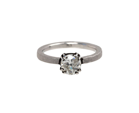 Brilliant in its sparkle and striking in its modern, minimal design, this Todd Pownell diamond solitaire has an edgy vibe and is a perfect alternative to the traditional engagement ring. The round, old European cut diamond is set in platinum prongs at the center of the blackened setting. It is centered on the matte, hammered platinum band.