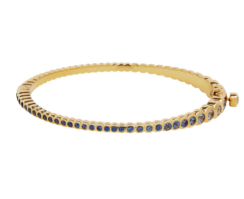 Perfect worn alone or layered with your other favorites, this Renna bracelet is a stunning update on the traditional tennis bracelet. The 18K yellow gold bubbles graduate in size and are each set with round blue sapphires that vary in tone from pale sky blue to deep ocean. It opens with an 18K yellow gold and diamond push safety clasp closure.