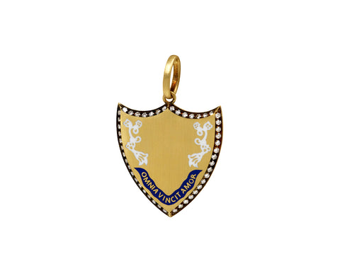 Symbolizing the loved ones and ideals that we protect, this Circa 1700 pendant will be your new personal talisman. The matte 18K yellow gold shield pendant has an oxidized halo set with small white diamonds. The blue enamel banner says 'omnia vincit amour' or, love conquers all and it sits beneath the white enamel accents. The shield hangs from the 18K yellow gold bale.