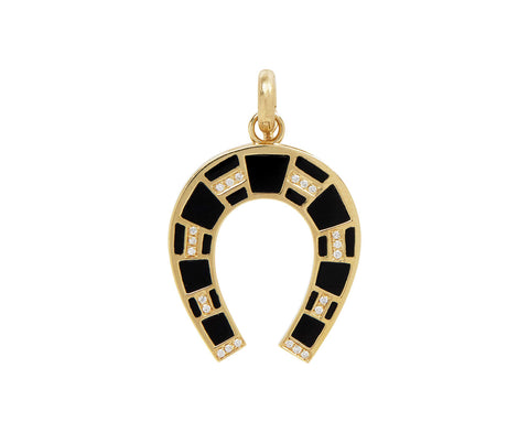 This stunning, shimmering Storrow charm is a jaw dropping example of modern meets vintage design. The 14K yellow gold horseshoe is set with black onyx inlay and rectangles of black enamel surrounding tiny, round white diamonds. It hangs from the 14K yellow gold latch clasp bale.