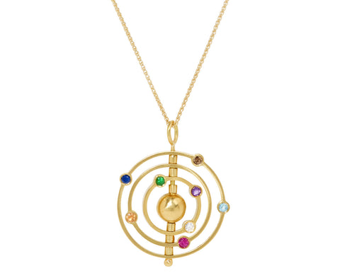 With its kinetic design and rainbow color, this Pari necklace has a sweet, playful symbolism. Each of the small, bezel set stones - including blue sapphire, orange sapphire, tsavorite garnet, ruby, amethyst and diamond - represent each planet in our solar system and are set around the 18K yellow gold circles that move independently from one another. The pendant hangs from the 14K yellow gold chain.