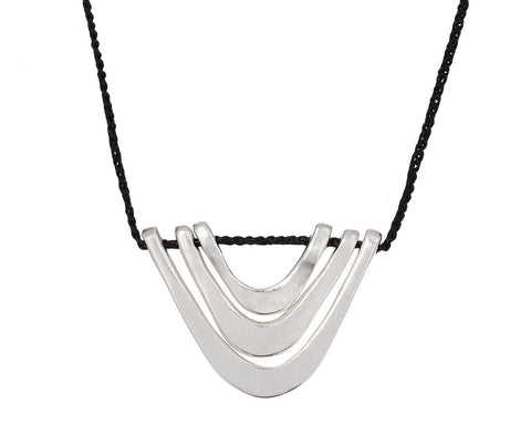 Inspired by the shapes and forms found in nature, Jill Platner has created a necklace with striking style and casual sophistication. The hand-forged curved bars of sterling silver are covered in a surface of subtle texture and fixed at the base of a crocheted black cord. The pendants hang in perfect alignment with one and other creating an interesting balance of positive and negative space.
