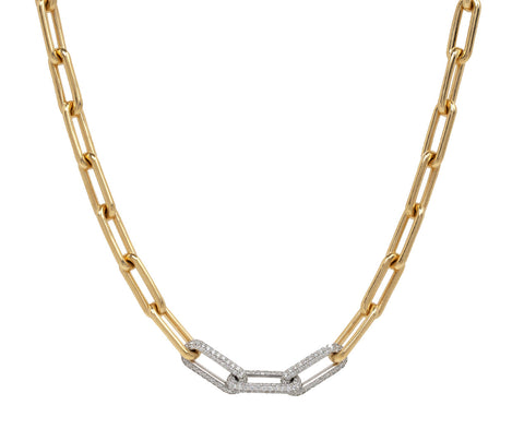 Bold, distinctive, and with an unparalleled modern sophistication, this Uniform Object necklace is an edgy take on the classic gold chain. The continuous strand of heavy, polished 18K yellow gold links are broken up by three platinum links that have been covered in a surface of shimmering white diamonds. It closes with their signature 18K yellow gold and diamond encrusted spur and push clasp closure.