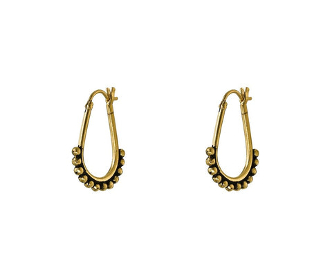 An unexpected shape takes these pear shaped granulated hoop earrings by Jane Diaz from everyday to extraordinary. Elongated gold plated hoops are adorned with a linear arrangement of granulation along their curved base. Channeling rich, Etruscan style, they hang close to your ear but will surely be noticed.
