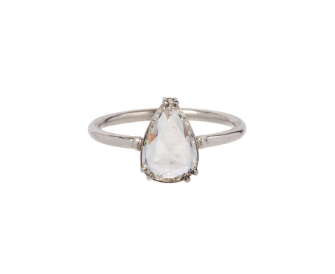 Sleek and sophisticated, this Tura Sugden ring is the perfect way to symbolize a commitment or engagement ceremony. The shimmering white pear-shaped rose cut diamond is covered in a surface of light reflecting facets to showcase a timeless sweet sparkle. It is held in place by three sets of meticulously handcrafted double prongs and centered on a platinum band.