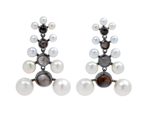 With their bold movement and edgy sophistication, these Nak Armstrong earrings come from the mosaic inspired Nakard Collection. The combination of smooth iridescent pearls and cabochon moonstone cascade from the post creating the perfect contrast. They connect to black rhodium plated sterling posts.