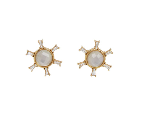 With their neutral color and earthy vibe, these Renna earrings have a modern, distinctive style. The faceted rock crystal has been backed by pink mother-of-pearl and bezel set in 18K yellow gold. Tapered white baguettes surround the center and radiate outwards. They attach to 18K yellow gold post backs and are perfect for everyday.