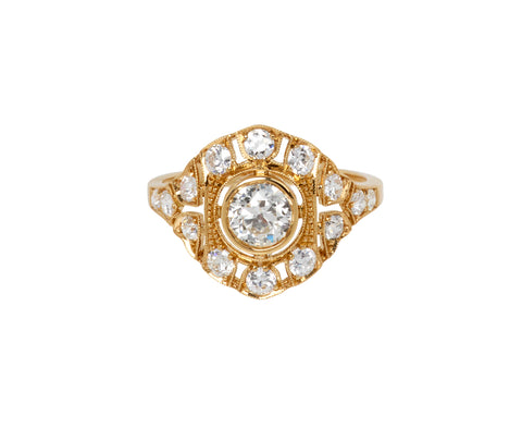 Dramatic and statement-making, this Single Stone ring has a stunning amount of sparkle and detail. The shimmering, round old European cut center stone is bezel set and framed by an intricate, hand-made 18K yellow gold and old European cut diamond setting. It is centered on the thin 18K yellow gold band.