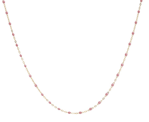 Statement making in its subtle sparkle and vibrant color, this Gigi Clozeau necklace exudes a youthful luxury. Set along the adjustable 18K yellow gold chain are tiny drops of blush resin. Alone or layered with your other favorites, it's a modern way to add a pop of color to any collection.