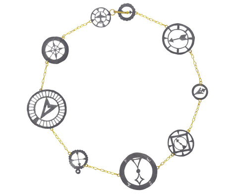 Let your style go any direction with this playfully sophisticated Judy Geib necklace. Her interpretation of the compass takes many renditions in the sterling silver, cut-out discs present in this long necklace. Some have arrows, others airplanes and some simply stars. They connect with segments of 18K gold chain to create a whimsical, eclectic look. Layered with your other favorites or worn alone, its distinctive design makes a style-defining piece of jewelry.