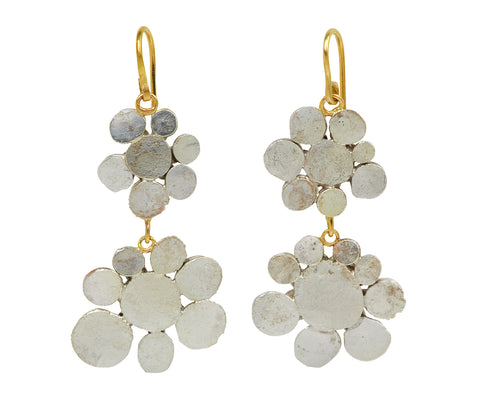 With her signature design and combination of metals, these Judy Geib earrings have an earthy elegance. The two sterling silver flowers are made up of individual squashes and connect by tiny 18K yellow gold loops. They hang from 18K yellow gold ear wires.