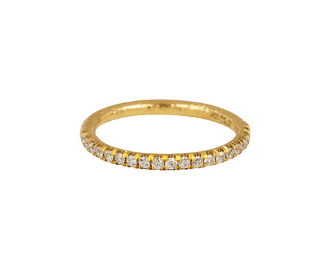 Classic, elegant and with a hint of sparkle, this Single Stone ring is a modern, minimal interpretation of the traditional eternity band. The round, old European cut diamonds are set along the top half of the textured 22K yellow gold band. Wear it alone to symbolize a wedding or anniversary, add it to a stacking collection, or pair it with one of their diamond solitaires for a stunning set.
