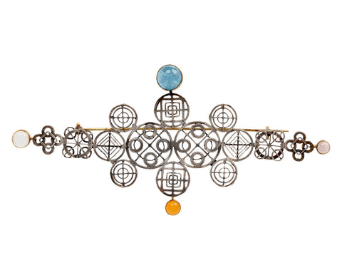 With its whimsical, silly design, this Judy Geib pin can be worn on the lapel of your favorite jacket. The sterling silver casino royale design is set with aquamarine, carnelian, pink quartz and moonstone at each corner. An 18K yellow gold pin is set along the back of the stem and fits into the little gold ring to secure it.