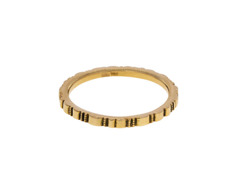 Earthy and understated, this Alex Sepkus band is a modern alternative to the traditional wedding ring. The 18K yellow gold thin band is a repetitive pattern of thin, vertical ridges and smooth segments. It could even be added to a stacking collection.