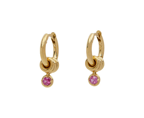 Ultra-elegant and modern, these Spinelli Kilcollin hoops are a stunning take on the everyday huggie hoop. The 18K yellow gold huggie has three 18K yellow gold annulets dangling from it, the center one which has been anchored by round, prong set pink sapphires. They connect to 18K yellow gold latch backs.