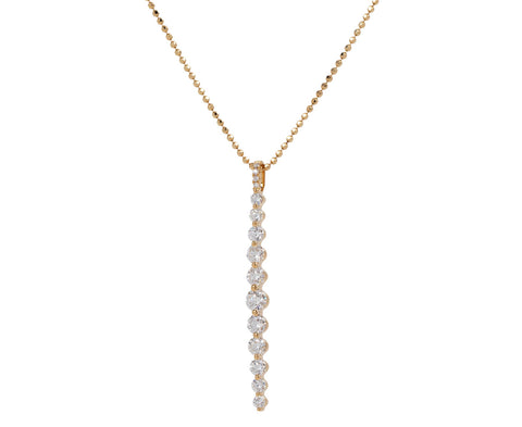 With its stunning, modern, minimalist design, this shimmering Anita Ko necklace exudes a bold, eye-catching vibe. Hanging from the center of the 18K yellow gold ball chain is a vertical cascade of diamonds (1.17cttw). Each of the brilliant cut stones is set in 18K yellow gold and the composition tapers as it ends. It attaches to a diamond encrusted bale.