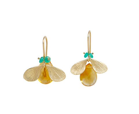 Full of eye-catching color and whimsical design, these Annette Ferdinandsen earrings are a playful addition to any jewelry collection. The faceted, golden yellow citrine body is accented with 14K yellow gold wings and smooth, emerald eyes. They dangle from 14K yellow gold ear wires.
