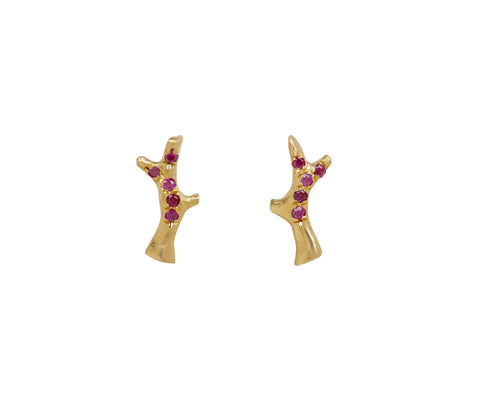 With their playful vibe, these Annette Ferdinandsen earrings are inspired by nature. Each 18K yellow gold thorn branch is set with tiny sparkling rubies. Worn in a first or second piercing, these are a fun addition to your collection.