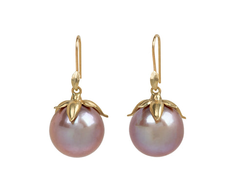 With their striking, nature-inspired design, these Annette Ferdinandsen earrings have a casual, earthy elegance. Luminous pink pearls hang under floral caps of 14K gold and dangle from golden ear wires. They create a pair of intriguing, sophisticated earrings.