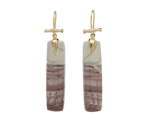 With their bold natural tones and large scale, these stunning Annette Ferdinandsen earrings are a one-of-a-kind alternative to traditional gem drops. The smooth, rectangular jasper connect to meticulously hand-crafted 14K yellow gold branch tops and ear wires. Dressed up or down, these earrings beg for a closer look.