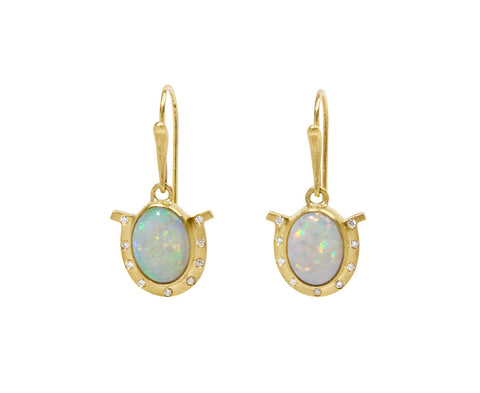 Wear these Annette Ferdinandsen earrings as a way to carry around a bit of luck and protection wherever you go. The 18K yellow gold horseshoe is dotted with tiny white diamonds and surrounds the smooth, oval opal center. They hang from 18K yellow gold ear wires.