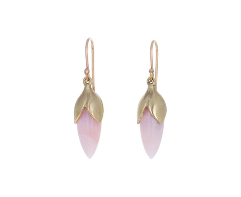 Pale pink opal hang from the hand-wrought golden leaves in these stunning Annette Ferdinandsen earrings. The stones hang below the carefully created, 14K gold leaves that connect to the ear wires to complete the nature-inspired flower buds. These are perfectly versatile and easy to wear.