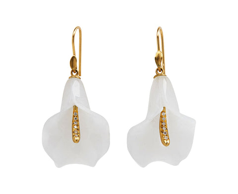 Elegant in their minimal interpretation of the classic cala lily, these earthy Annette Ferdinandsen earrings can easily be added to any collection. The smooth, white jade cala lily has an 18K yellow gold pistil covered in tiny shimmering diamonds. They hang from 18K yellow gold ear wires.