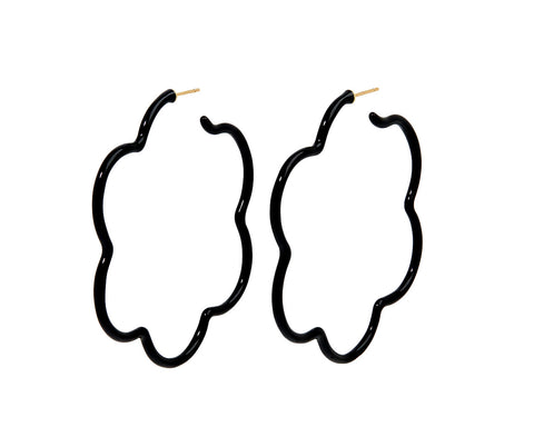 With their fluid design and playful style, these Bea Bongiasca hoops offer an elegance and funky sophistication. Each of the squiggly, floral sterling silver hoops is covered in black enamel and they connect to 9K yellow gold post backs.
