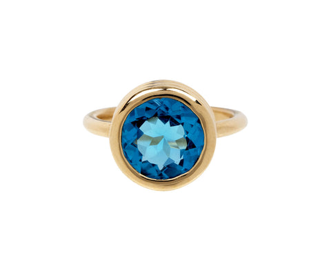 Inspired by her native Curacao and the sea that surrounds it, this Beck Jewels ring has a modern simplicity. The heavy, three tiered polished 18K yellow gold setting surrounds the bright blue faceted topaz. It's set at the center of the polished 18K yellow gold U band. Perfect on an index or middle finger for a pop of cool toned color.